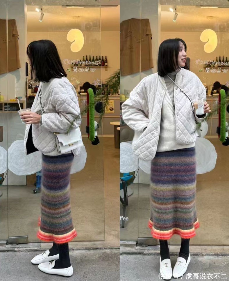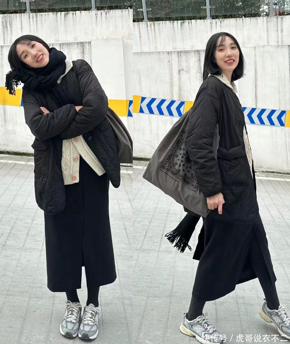 上图这位女士就展示了一种相比经典的穿法,那便是将半身裙与打底裤调节在沿途,宽松的裙身不错遮住不那么完整的双腿线条,打底裤又能保证肌肤辨别寒寒气味,可谓是一举两得。